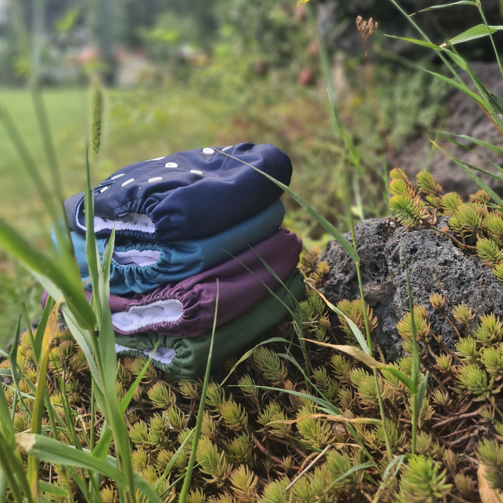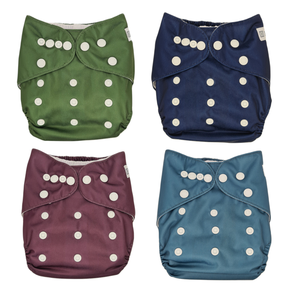 4 kapsové látkové plienky v rôznych farbách (slivková, týlová, tmavomodrá, lesná zelená) a 4 vložky